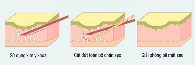Là kỹ thuật tốt nhất sử dụng trong điều trị sẹo đáy tròn. Phương pháp này sử dụng các đầu kim chuyên dụng luồn vào dưới da vùng sẹo để nhằm cắt đứt những dải xơ sợi nối đáy sẹo với mô da lành, đồng thời kích thích tái tạo mô liên kết, đẩy nền sẹo nông hơn, cải thiện độ lõm của da rất tốt.