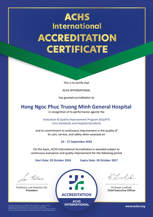 Việc đạt chứng nhận ACHS không chỉ khẳng định vị thế tiên phong của Bệnh viện Hồng Ngọc trong hệ thống y tế tư nhân Việt Nam, mà còn là cam kết vững chắc về chất lượng, an toàn và sự hài lòng của người bệnh những giá trị cốt lõi mà Hồng Ngọc luôn theo đuổi trên hành trình chăm sóc sức khỏe toàn diện.