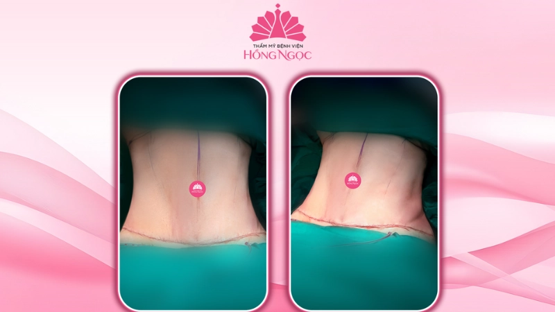Song song đó, bác sĩ tiến hành tạo hình thành bụng với đường mổ mảnh, vết khâu thẩm mỹ khéo léo để giấu sẹo kín đáo dưới đường viền quần lót. Kết quả, khoảng 2,2kg da và mỡ thừa được loại bỏ, đồng thời xử lý vùng viêm tồn dư, giúp tái tạo dáng bụng gọn gàng, rốn được tạo hình lại tự nhiên và hài hòa với tổng thể cơ thể.