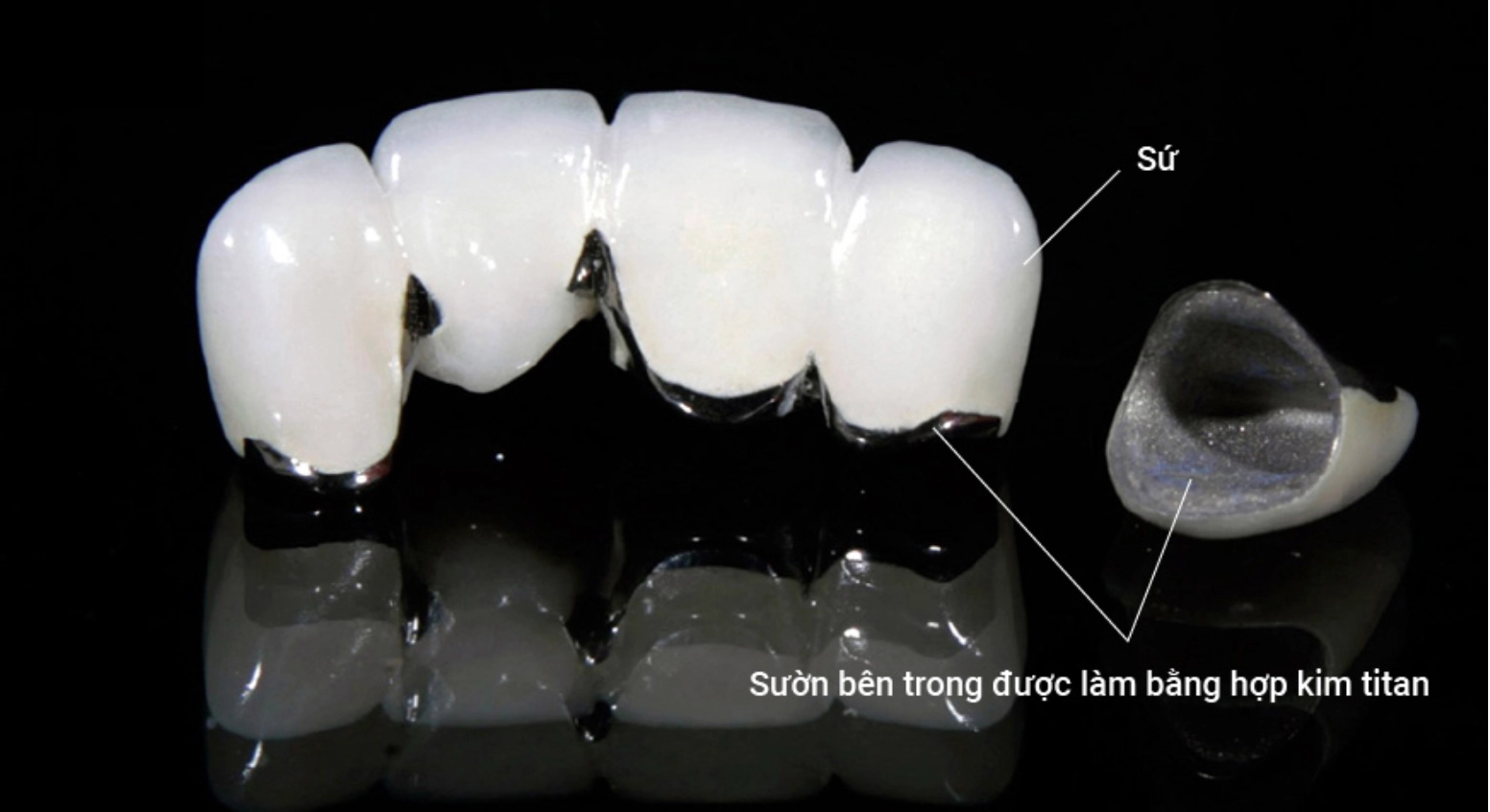 Khung sườn Titan: được làm từ hợp kim Niken – Crom – Titan, trong đó Titan chiếm khoảng 3–6%, giúp răng có trọng lượng nhẹ, độ cứng cao và ít bị ăn mòn trong môi trường khoang miệng