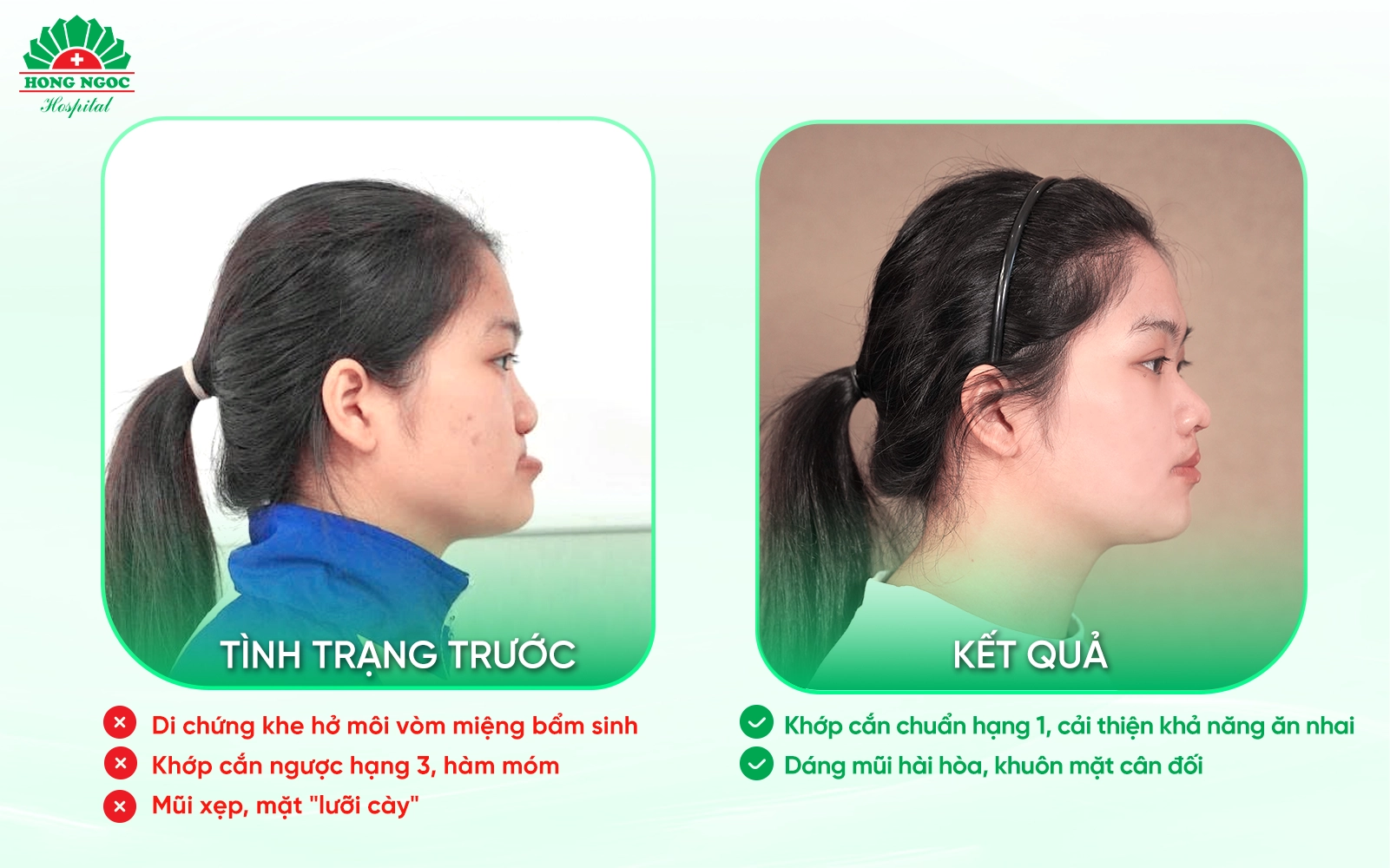 Nhờ sự hỗ trợ từ chương trình “Chắp cánh ước mơ” tại Bệnh viện Hồng Ngọc, em đã được thực hiện phẫu thuật chỉnh hình xương hàm chỉnh hình xương hàm trên kết hợp hàm dưới. Ca phẫu thuật đã giúp đưa khớp cắn ngược loại III về khớp cắn chuẩn hạng I, đồng thời cải thiện đáng kể hình thể khuôn mặt. Sau đó, em tiếp tục được can thiệp phẫu thuật sửa mũi bằng sụn sườn tự thân, góp phần mang lại diện mạo cân đối, hài hòa hơn.