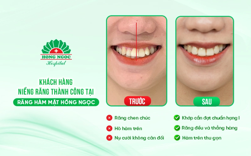 Tại Răng Hàm Mặt Hồng Ngọc, các khách hàng sau niềng răng đều ghi nhận sự cải thiện rõ rệt về thẩm mỹ và chức năng ăn nhai, với khớp cắn chuẩn hạng I và răng không chạy lại sau điều trị. Mỗi ca chỉnh nha đều được bác sĩ chuyên khoa theo sát 1:1 cùng phác đồ cá nhân hóa, dây cung thiết kế riêng, giúp nhiều trường hợp rút ngắn được thời gian niềng đến 6 tháng và hạn chế tối đa việc nhổ răng.