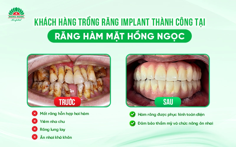 Điển hình như trường hợp của chú Lê Quý Quang, từng gặp phải tình trạng mất răng hỗn hợp ở cả hai hàm, viêm nha chu nặng khiến răng lung lay, việc ăn nhai vô cùng khó khăn và sức khỏe tổng thể bị giảm sút. Sau khi thăm khám, bác sĩ tại Răng Hàm Mặt Hồng Ngọc đã chỉ định phục hình toàn 2 hàm bằng phương pháp trồng răng Implant All on 6 với 12 trụ Implant. Giải pháp này đã giúp chú khôi phục hoàn toàn chức năng ăn nhai, sở hữu hàm răng chắc khỏe và thẩm mỹ tự nhiên, cải thiện rõ rệt chất lượng cuộc sống.