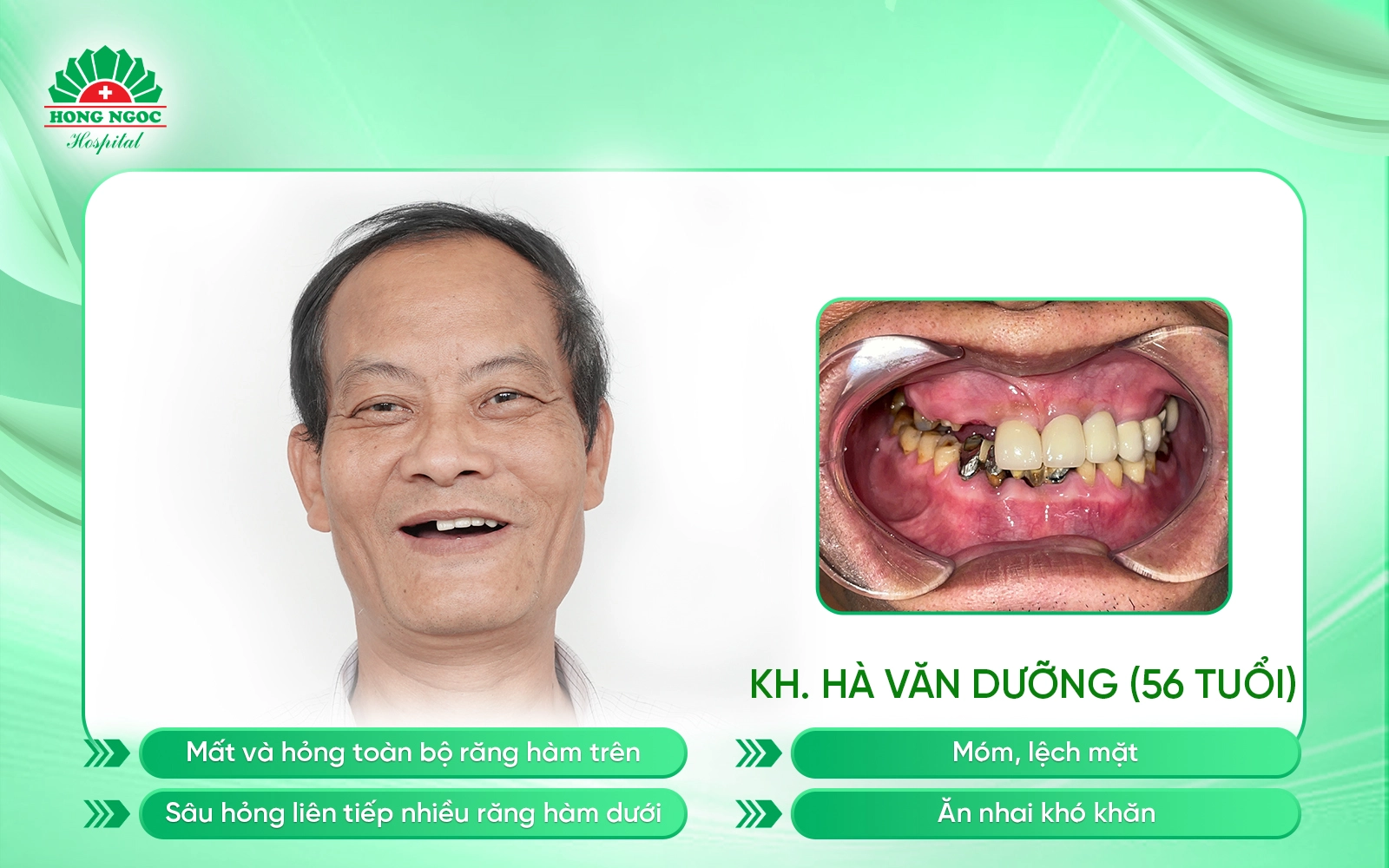 Ở tuổi ngoài 50, chú Dưỡng bắt đầu gặp nhiều vấn đề về răng miệng. Toàn bộ răng hàm trên hỏng nặng, nhiều răng hàm dưới sâu liên tiếp khiến gương mặt bị móm, hóp lại trông thiếu sức sống và việc ăn uống trở nên rất khó khăn. Chú kể rằng có nhiều món muốn ăn nhưng không thể nhai, tình trạng này kéo dài khiến cơ thể gầy yếu đi, dạ dày bị ảnh hưởng và sức khỏe suy giảm rõ rệt. Vì hàm răng hỏng nên cũng ngại giao tiếp, ít cười và mất tự tin khi gặp gỡ mọi người xung quanh.