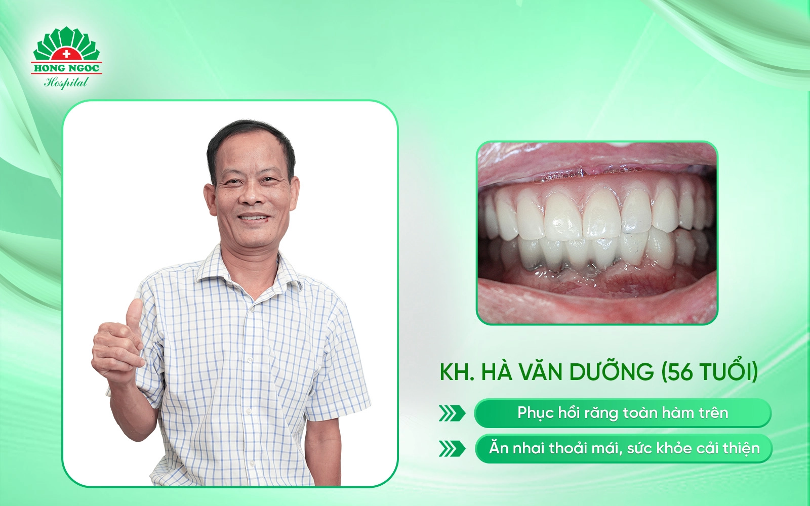 Chú vui vẻ kể rằng trước đây chỉ ăn được cháo và cơm nát, giờ thì có thể ăn rau xào, cơm, thậm chí cả những món cứng hơn. Sức khỏe cải thiện rõ rệt, chú đã tăng thêm 2kg. Người ngoài nhìn thấy đều khen hàm răng đẹp hơn cả hồi chưa hỏng, còn vợ chú thì bảo: “Anh có bộ răng đẹp trai quá”. Các con cũng mừng vì bố khỏe mạnh, tự tin và vui vẻ hơn trước.