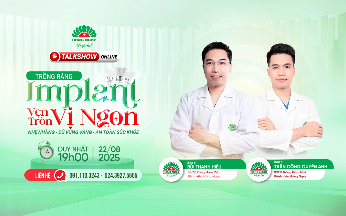 Bên cạnh việc thăm khám và điều trị, Răng Hàm Mặt Hồng Ngọc thường xuyên tổ chức các buổi Talkshow chuyên đề để khách hàng hiểu rõ hơn về Implant trước khi quyết định. Ngày 22/08/2025, khoa Răng Hàm Mặt Bệnh Viện Hồng Ngọc sẽ tổ chức Talkshow online “Trồng răng Implant: Vẹn tròn vị ngon” với sự tham gia của các bác sĩ chuyên khoa giàu kinh nghiệm. Chương trình không chỉ mang đến những chia sẻ thực tế, giải đáp chi tiết về quy trình và các lưu ý để ca điều trị diễn ra an toàn, bền đẹp, mà còn là dịp để con cái tìm cho cha mẹ một giải pháp phục hình răng vững chắc, giúp cha mẹ ăn ngon, sống khỏe và giữ trọn nụ cười trong từng khoảnh khắc sum vầy bên con cháu.